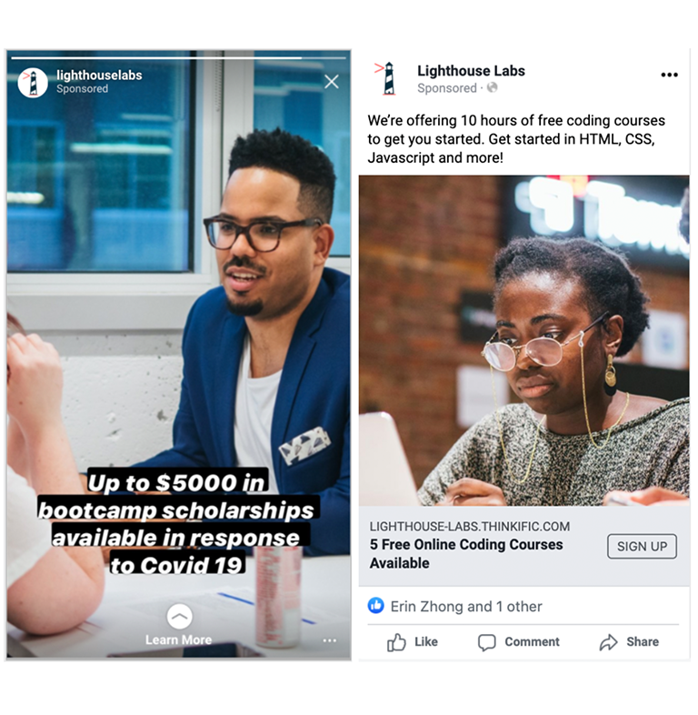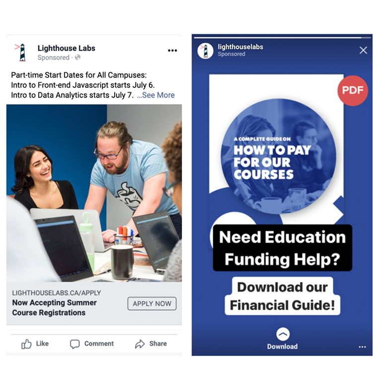 Before COVID-19, LHL’s paid advertisements targeted a specific geographic audience: people who were interested in coding and lived within 25 kilometres from a Lighthouse campus. Since online classes did not require students to attend physical classes, we had to segment away from geographic targeting. To achieve this, we opened up the geographic area and instead segmented our awareness campaign into niche occupations and behaviours that also indicated their interest in technology, coding, and data. For example, specifically reaching out to designers, marketers, and other relevant segments. Last, we reframed the top of the funnel by leveraging Lighthouse Labs’s free online courses. By positioning these courses as our segments’ starting point to prospect’s journey in data or development, we were able drive highly efficient leads ($6.15 per, previously about $15 per). Retroactive analysis showed about 10% of bootcamp applications took this course beforehand, making these signups highly profitable.