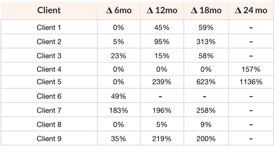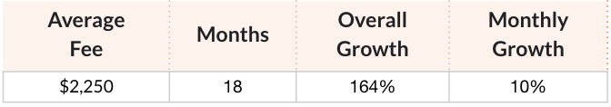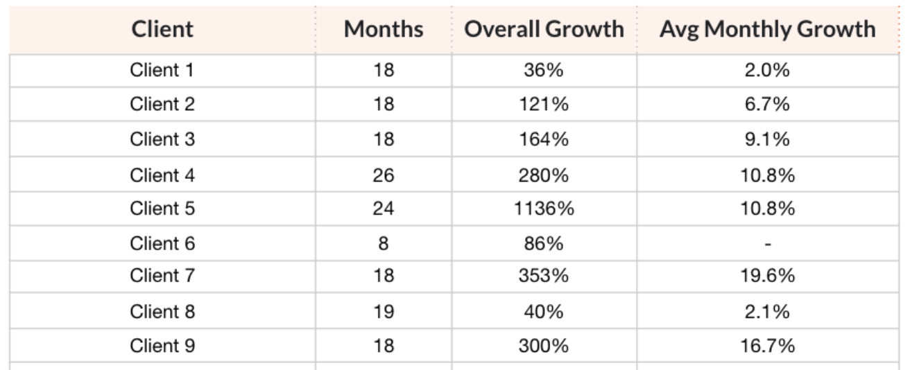 After implementing our strategy for a median of 18 months, our clients saw an overall growth of 164% and a monthly growth of 11%.
